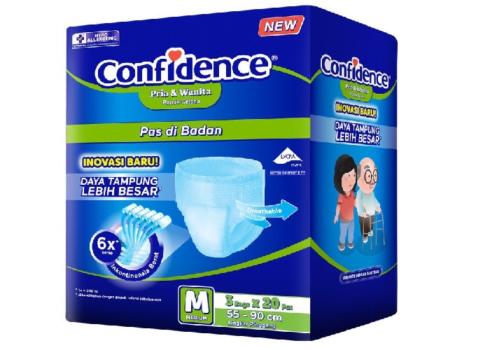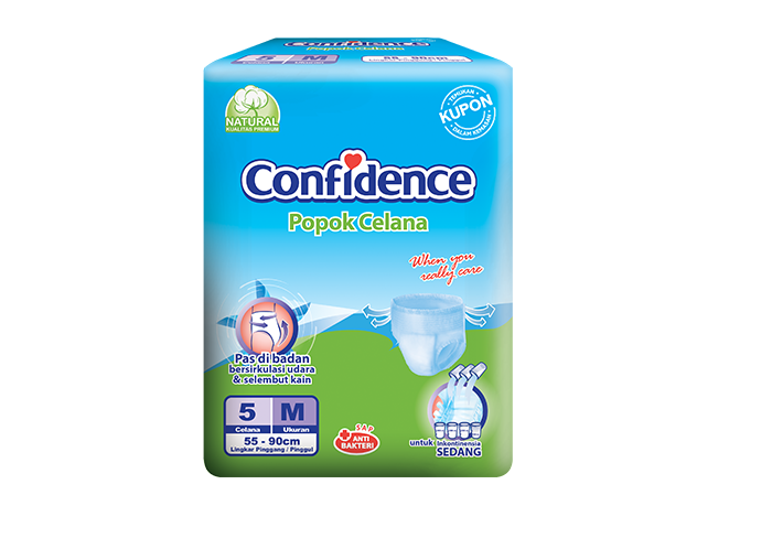 CONFIDENCE merekat erat, dapat dilepas dan dipasang berulang kali. Menyerap cairan lebih cepat lalu mengubahnya menjadi gel, Permukaan yang extra lembut dan tetap kering. Tersedia varian Classic day, classic night dan pe Celana untuk ukuran M,L,XL